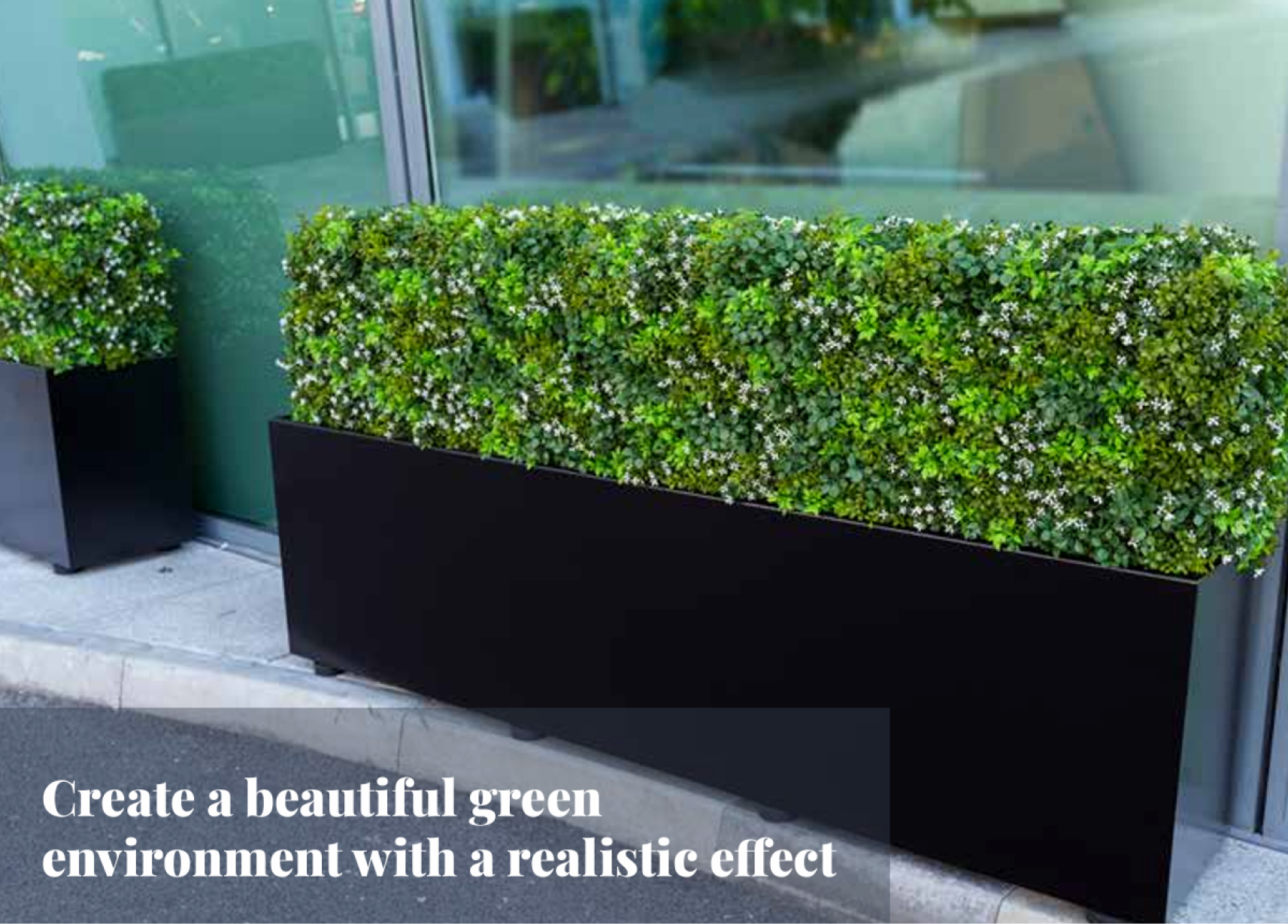 ✔ Ultra-realistic artificial foliage ✔ 5 years’ warranty ✔ Stainless Steel backing ✔ Customisable ✔ Suitable for all weathers ✔ Seamless Installation ✔ No maintenance ✔ ISO quality standards ✔ REACH & ROHS tested ✔ UV & IFR Technology