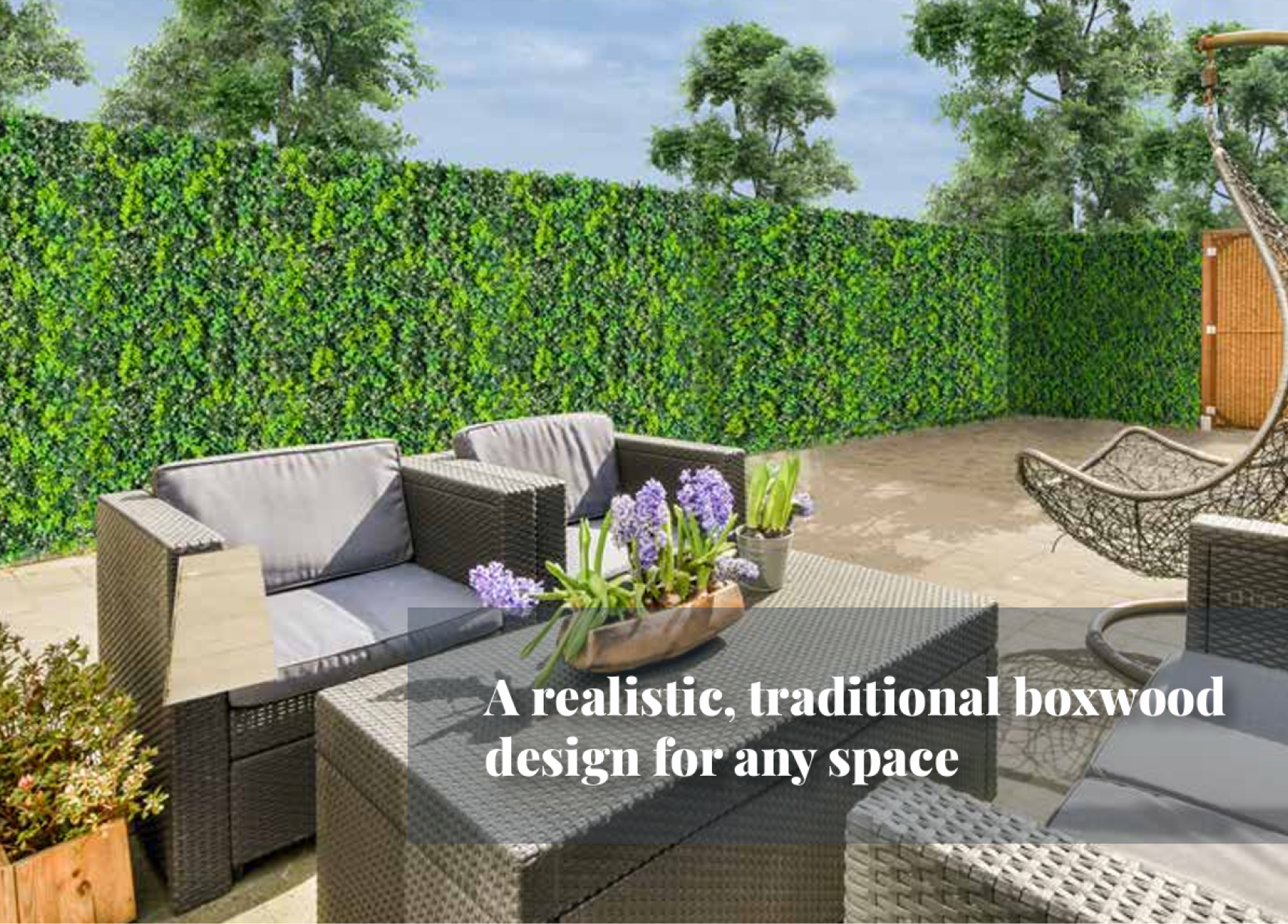 ✔ Ultra-realistic artificial foliage ✔ 5 years’ warranty ✔ Stainless Steel backing ✔ Natural looking design ✔ Suitable for all weathers ✔ Seamless Installation ✔ No maintenance ✔ ISO quality standards ✔ REACH & ROHS tested ✔ UV & IFR Technology